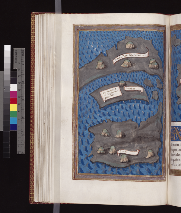 27 сентября два корабля двинулись на поиски Островов Пряностей. По пути схватили наместника Пулаоана (на побережье Минданао), заставив его выдать для выкупа четыреста мешков риса, по двадцать свиней и коз, и сто пятьдесят кур. Сверх требований малайцы поставили кокосы, бананы, сахарный тростник и пальмовое вино: расставание прошло мирно[174]. Вскоре европейцы атаковали встреченную джонку, вырезав семерых из восемнадцати членов экипажа, когда выпытывали направление на Острова Пряностей. Пигафетта упоминал об этом мельком, как о само собой разумеющемся событии. Один из пленников действительно смог указать курс на юго-восток. Пережив бурю 26 октября, на острове Кавите команда захватила двух малайских лоцманов, и двинулась курсом юго-юго-запад. Армаду преследовали несчастья: при разрыве аркебузы при стрельбе 2 ноября был убит матрос «Тринидада» Педро Санчес, а ещё через два дня на флагмане от разрыва порохового заряда погиб артиллерист Хуан Баутиста. Наконец, 6 ноября пленник-лоцман заявил, что показались Молуккские острова, в честь чего был дан артиллерийский салют. По подсчётам Пигафетты, для достижения цели экспедиции понадобилось «двадцать семь месяцев без двух дней»[175].