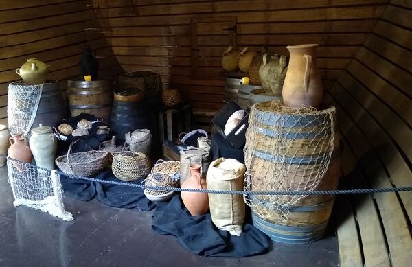 По расчётам Ф. Фернандеса-Арместо, проанализировавшего счета за провиант, запасов должно было хватить лишь на 776 суток при половинном пайке; то есть обещание короны предоставить запасы на два года не было выполнено. Все запасы рассчитывались на 234 человека, упомянутых в королевских капитуляциях. Основу рациона составляли сухари (2138 квинталов)[Прим. 3], и некоторый запас муки для выпечки свежего хлеба на начальном этапе плавания (её замешивали на морской воде)[46]. Основу белкового питания составляли рыба (200 бочек анчоусов и 238 связок вяленой рыбы), кроме того, на борт каждого корабля взяли рыболовные снасти и наживки, в том числе 10 500 рыболовных крючков. Мясо было праздничным блюдом: было взято всего 57 квинталов солонины, а также семь живых коров (они давали молоко) и три свиньи. Имелось 90 фанег нута, 50 фанег фасоли и две фанеги чечевицы. Самый большой из шести кухонных котлов вмещал 55 фунтов пищи. Также в перечне провианта упоминаются 200 арроб уксуса (если это севильская мера, запас очень невелик) и 47 квинталов оливкового масла. Основную статью расходов составили 415,5 пип вина из Хереса, которого на «Викторию» было погружено 82 бочки, а на «Консепсьон» 89. Уксус и вино служили, в первую очередь, для обеззараживания пресной воды, которая неизбежно затухала в бочках. Судовой рацион XVI века предусматривал более 1 литра вина на человека в сутки[47][48].