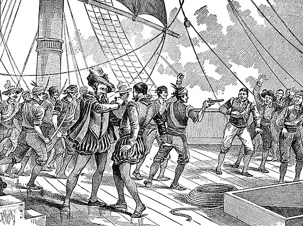 Мятежники потребовали подчинения Магеллана королевским инструкциям и раздела власти с представителями испанской партии, отчасти, это отражалось и на титуловании, которое было принципиальным вопросом для дворян XVI века. Магеллан предложил встретиться, но был отвергнут. Тогда на «Викторию» был отправлен Гонсало Гомес де Эспиноса с шестью матросами-гребцами. Пока Мендоса читал письмо капитан-генерала, Эспиноса ударил его в шею кинжалом, а затем добил. Далее с другой стороны подошла барка с Дуарте Барбозой и, по крайней мере, пятнадцатью моряками. Над «Викторией» был поднят стяг Магеллана, а команда не сопротивлялась[Прим. 13]. К 3 апреля Магеллан перевёл свои суда к выходу из залива, не позволяя «Консепсьону» и «Сан-Антонио» уйти. Мятежники использовали Мешкиту как заложника, привязав его на носу, откуда он взывал к капитан-генералу не открывать огня. Наконец, к ночи оба корабля были взяты на абордаж, а Кесада и де Кока арестованы. 4 апреля труп Мендосы был перевезён на берег и четвертован. На Пасху (7 апреля) Кесада был обезглавлен, а тело его подвесили рядом с разрубленными останками Мендосы на берегу[Прим. 14]. Хуана де Картахену и священника Педро Санчеса де Рейну приговорили к высадке на близлежащем острове незадолго до ухода флотилии из Сан-Хулиана[98], оставив им только нож и один сухарь (судя по реестру смертей, составленному по показаниям выживших, это было 11 августа). Трибунал изобличил в поддержке мятежа ещё сорок человек, включая Хуана Себастьяна де Элькано, но казнить их не было никакой возможности — это были профессиональные моряки, два штурмана (включая Андреса де Сан-Мартина) и военные. Позднейшие сообщения свидетельствовали, что помилованных приговорили к каторжным работам до окончания южной зимы и даже отправили на разведку по суше. Они прошли 40 лиг, но никакого пролива не обнаружили[99].