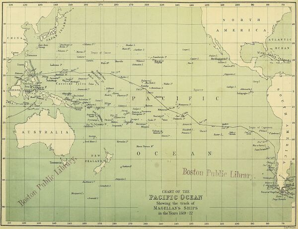 Максимилиан Трансильван со слов участников плавания назвал Тихий океан «более обширным, чем может вообразить человеческий разум» (лат. vastius quam ullum humanum ingenium caperet). Он же утверждал, что ни Магеллан, ни штурманы не могли ожидать, что армада сможет двигаться так быстро: в некоторые дни корабли проделывали в сутки до семидесяти лиг (то есть примерно 200 морских миль)[128]. Выйдя из пролива, Магеллан пятнадцать дней шёл на север по течению, дойдя до 38° ю. ш., где повернул на северо-запад, а 21 декабря 1520 года, дойдя до 30° ю. ш., повернул на запад-северо-запад. Земля исчезла из вида после 17 декабря[129][130].