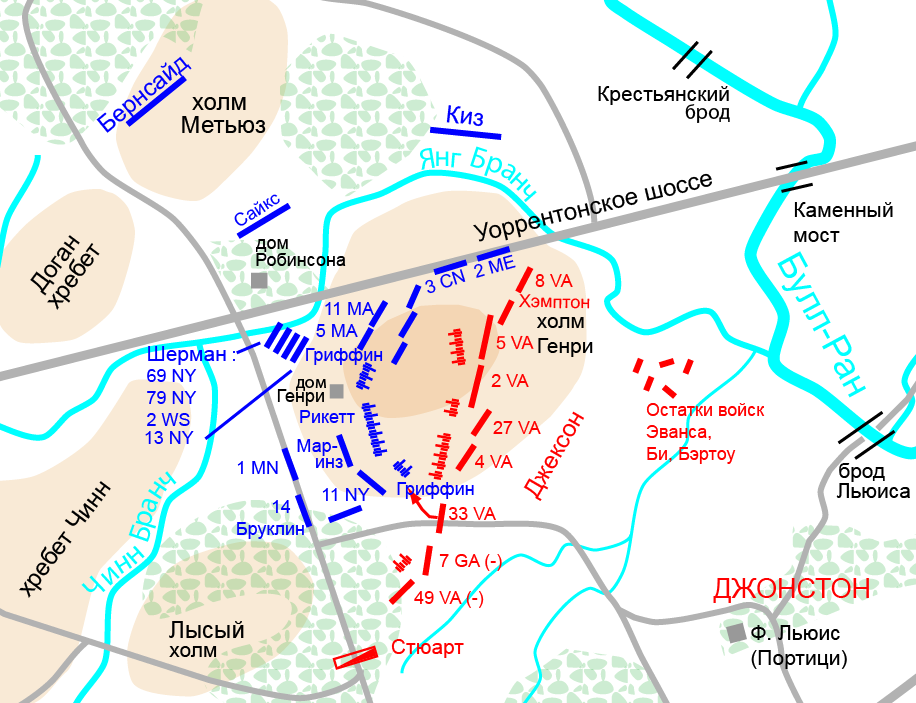 11-й Нью-Йоркский пехотный полк — «Огненные зуавы» — встал позади орудий Рикеттса. Морские пехотинцы встали левее, а 1-й Миннесотский правее. 14-й Бруклинский задержался у переправы через Янг-Брэнч, а 38-й Нью-Йоркский поднялся на холм и встал левее дома Генри, где оказался даже раньше, чем батарея Гриффина. Развернулась ожесточённая орудийная перестрелка на короткой дистанции. Генерал Джексон разъезжал вдоль своей пехотной линии, повторяя: «Всё хорошо…» «Он казался очень спокойным, — вспоминал рядовой 5-го Вирджинского, — и мы решили, что действительно всё в порядке и что обычно сражения так и выглядят»[68].
