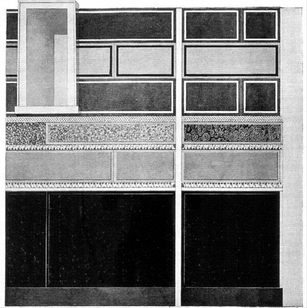 Первый стиль не был чисто римским, он был эллинистическим. Действительно, если поискать примеры более ранние, чем найденные в районе Везувия, то в Делосе и других греческих городах, таких как Пантикапей на Черном море, в здании, датируемом, благодаря монетам, III–II веком до н. э., мы найдём карниз со светотенью фиктивного рельефа и мотивом полуколонн из гипса.