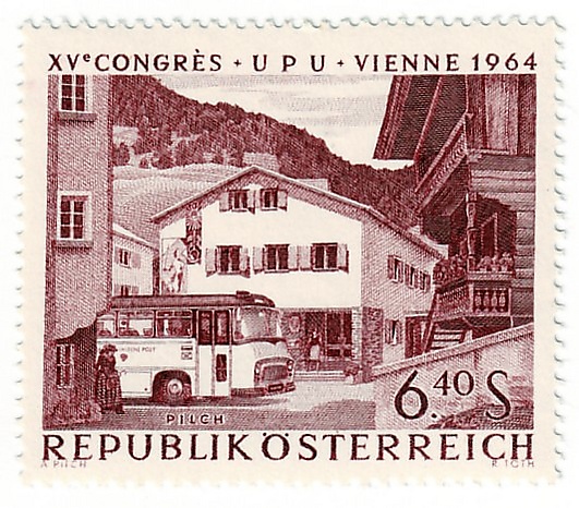 Ещё более распространены в Австрии de|ÖBB-Postbus для транспортировки одновременно почты и пассажиров[15]. В 1964 году почтовые автобусы были запечатлены на двух австрийских марках из серии, посвящённой XV Всемирный почтовый конгресс в Вене. Рисунки обеих марок были выполнены художником Адальбертом Пильхом (англ. Adalbert Pilch) на основе собственных произведений, которые показывали почтовые автобусы в горных населённых пунктах — в высокогорье (Mi #1192; Sc #735) и в Заальбахе (Mi #1193; Sc #736).