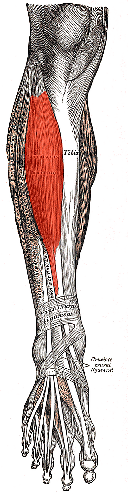 Мышца длинная, узкая, лежит поверхностно, занимая наиболее медиальное положение из всех мышц этой группы. Внутренним краем она граничит с передним краем большеберцовой кости, а наружным в проксимальном отделе — с длинным разгибателем пальцев (лат. M. extensor digitorum longus), в дистальном — с длинным разгибателем большого пальца (лат. M. extensor hallucis longus)[1].