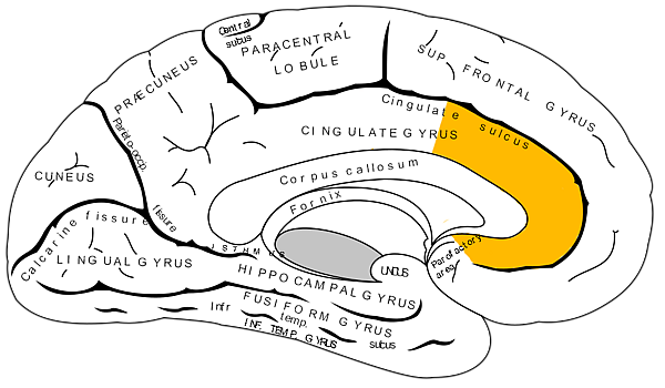 Анатомически ППК может быть разделена на когнитивную (дорсальную) и эмоциональную (рострально-вентральную) компоненты.[4] Дорсальная часть ППК связана с префронтальной корой и теменной корой, а также двигательной системой и фронтальными глазными полями[5], что делает её центральным участком обработки «нисходящих» (англ. top-down, связанных с целеполаганием) и «восходящих» (англ. bottom-up, связанных с сиюминутными решениями) стимулов и посылкой контрольных сигналов в другие области мозга. Напротив, рострально-вентральная часть связана с миндалевидным телом, прилежащим ядром, гипоталамусом и передней островковой корой и выполняет функции оценки характерных признаков эмоциональной и мотивационной информации. Имеются данные, что ППК особенно активна тогда, когда для решения задачи требуется приложить мысленное усилие или сконцентрироваться.[6]