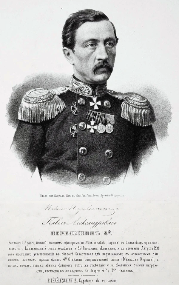 Па́вел Алекса́ндрович Переле́шин (27 июня 1821, усадьба Щетинино, Костромская губерния — 28 февраля 1901, Санкт-Петербург) — адмирал, ученик адмирала Нахимова, «деятельный помощник адмиралу Истомину в Синопском сражении и при защите Малахова кургана», почётный гражданин Севастополя; Севастопольский градоначальник, командир порта и комендант (1872—1876). 18.11.1898 в Севастополе, во время открытия памятника адмиралу П. С. Нахимову, он лично рассказывал присутствовавшему на торжестве Николаю II о Синопе и о 349-дневной обороне «Русской Трои». Вполне закономерно, что после кончины адмирала Перелешина император повелел захоронить Павла Александровича в соборе святого Владимира, «дабы тот мог после смерти соединиться со своими боевыми товарищами».
