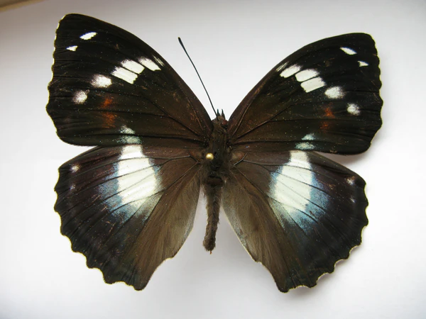 Верхняя сторона крыльев буровато-чёрная с белым рисунком, а также голубоватыми и ржаво-бурыми пятнами на передних крыльях. Задние крылья несут широкую белую перевязь с голубыми переливающимися краями. Нижняя сторона задних крыльев бледно-зеленовато-голубая с серебристым блеском и с оливкового цвета перевязью.