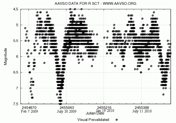 R Щита может быть менее яркой, чем приведено в таблице. Она может испытывать тепловые пульсации, наблюдаемые в фазе гелиевого горения, а не быть пост-АВГ звездой[12]
