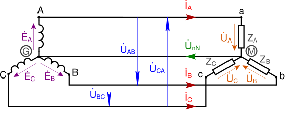 - Соединение «звездой» с нейтральным проводом — четырёхпроводное, нейтральный провод обеспечивает независимость работы только одной фазы потребителя от другой фазы, так как при малом падении напряжения в проводах напряжения на фазах потребителя относительно мало изменяются с изменением нагрузки фаз. Применяется при неравномерной нагрузке на фазы.