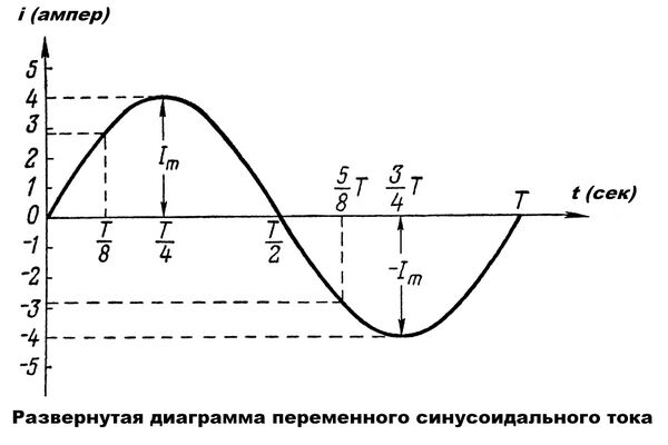 На рисунке приведена развёрнутая диаграмма переменного тока, изменяющегося с течением времени по величине и направлению. На горизонтальной оси — оси времени — в определённом масштабе отложены отрезки времени, а по вертикальной оси — сила тока, причём в направлении вверх выбрано положительное направление, а вниз — отрицательное.
