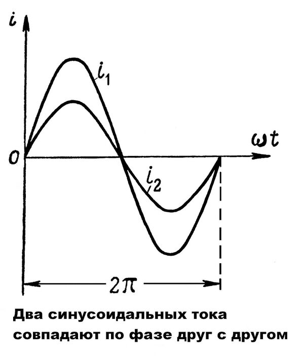 Два переменных синусоидальных тока совпадают по фазе, если они имеют одинаковые фазы и, следовательно, одновременно достигают своих нулевых и максимальных значений одинакового знака.