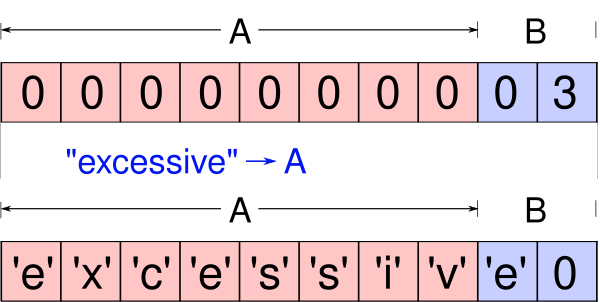 В следующем примере на языке C программа содержит две переменные, расположенные рядом в памяти: строковый буфер длиной 8 байт a и двухбайтовое целое число (без знака, в big-endian) b: