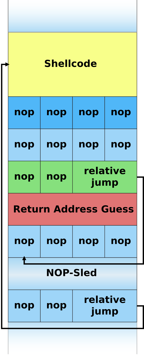 NOP-sled — древнейшая и наиболее известная техника эксплуатации переполнения стека. Её цель — увеличить область поиска точного адреса буфера: большая часть стека заполняется командами no-op (нет операции), за которыми размещается инструкция перехода к вершине буфера — там находится шеллкод. Эта последовательность no-op называется «NOP-скользящей дорожкой»: если адрес возврата перезаписан любым указателем в область NOP-сегмента, выполнение просто «скользит» по no-op до перехода к вредоносному коду. Эта техника требует догадки, где именно на стеке расположен сегмент, но увеличивает вероятность успеха.
