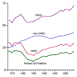 В 1980-х годах мировая добыча нефти, из-за сокращения добычи странами ОПЕК, также несколько сократилась. Однако прочие нефтедобывающие страны, включая СССР, наращивали добычу, что во многом определило затоваривание рынка и привело к возобновлению роста добычи нефти после 1983 года[13]. Если в 1970-х годах на долю стран ОПЕК приходилось около половины мировой добычи нефти, то к 1985 году она снизилась до менее чем одной трети[14][15].