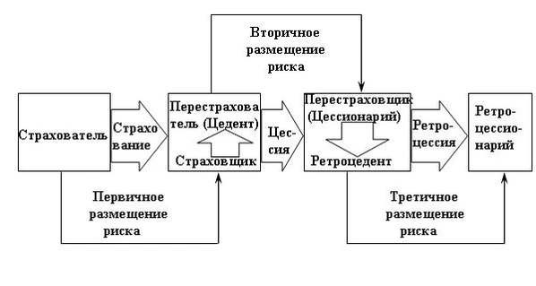 Схема взаимодействия перестраховщика в рамках договора первичного перестрахования (цессии) и вторичного и последующего перестрахования (ретроцессии) представлена на рисунке.