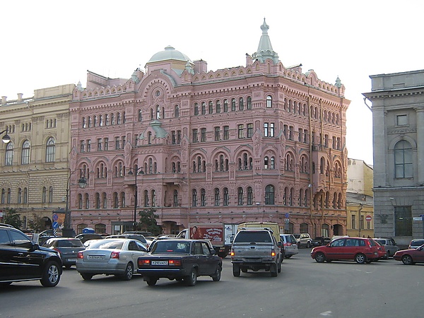 Доходный дом архитектора Н. П. Басина, построенный в русском стиле в 1878—1879 годах по его собственному проекту при участии Н. Н. Никонова. Пятиэтажное здание с двумя фасадами, эркерами (особенно угловой), увенчанными башенками, придающими ему объёмность. Фасад выполнен со множеством деталей с разнообразными по рисунку окнами с резными «полотенцами», венчающими карниз кокошниками, сандриками, столбиками-кубышками. Все фасады щедро украшены лепниной, воспроизводящей декоративные мотивы русской деревянной резьбы и вышивки. Он является хрестоматийным примером игнорирования ансамбля Александринского театра, созданного в эпоху классицизма, так как живописный силуэт, насыщенность декора выделяют дом из окружающей застройки[5].