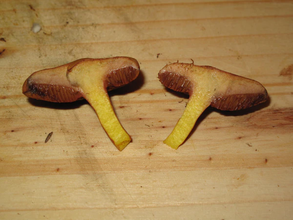 Ножка 3—8 см высотой и 0,3—1,5 см толщиной, цилиндрическая, часто изогнутая, обычно суженная книзу, сплошная, плотная, ломкая, цвет ножки тот же что и у шляпки или более светлый, у основания — жёлтый.