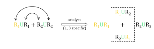 При случайной переэтерификации жирнокислотные радикалы свободно перемещаются с одной позиции на другую в одном и том же глицериде, или от одного глицерида к другому. После перегруппировки жирных кислот достигается равновесие, которое основано на составе исходного сырья[1]. Если переэтерификация применяется к двум чистым триглицеридам, каждый из которых с тремя идентичными жирными кислотами (AAA и BBB), результат может содержать шесть различных триглицеридов (AAA, AAB, ABA, ABB, BAB и BBB). Число равно 6, а не 23 = 8, из-за симметрии основной цепи глицерина. Это число намного больше, если сырье содержит три или более различных жирных кислоты[7].