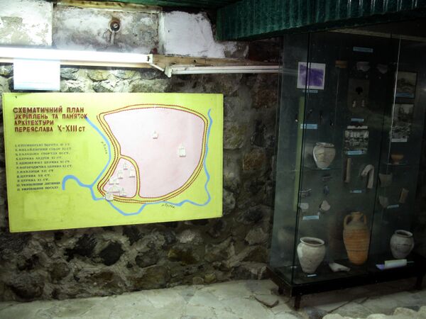 В северной части детинца размещался княжеский двор с Княжескими воротами, а в южной — епископский двор с Епископскими воротами. Главной постройкой епископского двора, как и всего детинца, был Михайловский собор, построенный к 1089 году. Он был одним из крупнейших храмов на Руси того времени и являлся усыпальницей переяславских князей. Рядом с ним, на епископском дворе находился епископский дворец. К северу от Епископких ворот находилась небольшая летописная Андреевская церковь, а севернее дворцового сооружения безымянная однонефная церковь с притвором. На княжеском дворе в северной части детинца находилась летописная церковь Успения Богородицы, построенная Владимиром Мономахом в 1098 году. В северо-западной части детинца по соседству с княжеским двором находилась небольшая бесстолпная церковь XII века.