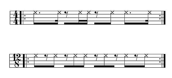 Второе определение периода в New Harvard Dictionary of Music гласит: «Музыкальный элемент, который каким-либо образом повторяется», применяя это понятие «к единицам любого параметра музыки, воплощающим повторения на любом уровне»[14]. В некоторых традициях африканской музыки и музыки африканской диаспоры ритм колокольчика воплощает это определение периода[15]. Ритм колокольчика (также известный как ключевой рисунок[16][17], опорный рисунок[18], фразовый ориентир[19], таймлайн[20] или асимметричный таймлайн[21]) повторяется на протяжении всего произведения и является одной из основных единиц музыкального времени для ансамбля, лежа в основе ритмов аккомпанирующих партий, а также мелодий и импровизаций[22][23]. Длина периода обычно составляет два или четыре основных доли[24][25][18]. (См. тресильо и синквильо для примеров двухдольных периодов.) Четырёхдольные периоды могут быть записаны в западной нотации как один такт, как в приведённых примерах; см. также раздел «Клаве» ниже для альтернативного представления.