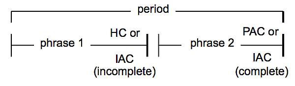 - «Период обычно представляет собой восьмитактовую структуру, делённую на две четырёхтактовые фразы. [...] Предшествующая фраза периода начинается с двухтактовой основной идеи. [...] Такты 3–4 предшествующей фразы содержат 'контрастную идею', ведущую к слабой каденции. [...] Последующая фраза повторяет предшествующую, но завершается более сильной каденцией. Более конкретно, основная идея 'возвращается' в тактах 5–6, затем следует контрастная идея, которая может быть основана или не основана на идее предшествующей фразы»[12].