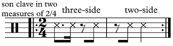 Следует отметить, что в большинстве кубинской и кубино-ориентированной популярной музыки, такой как сальса, две половины рисунка меняются местами: дву-сторона становится предшествующей, а три-сторона — последующей. См. статью клаве для более подробного объяснения.