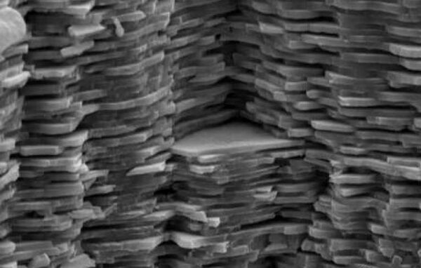 Перламутр состоит из шестиугольных пластинок арагонита (кристаллов карбоната кальция CaCO3) размерами 10-20 микрон в ширину и 0,5 микрона в толщину, расположенных параллельными слоями. Эти слои разделены листами органической матрицы, состоящей из эластичных биополимеров (таких как хитин, люстрин и шёлкоподобные белки).