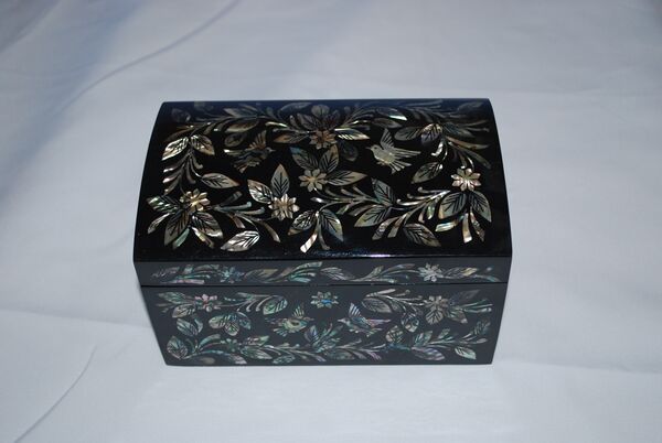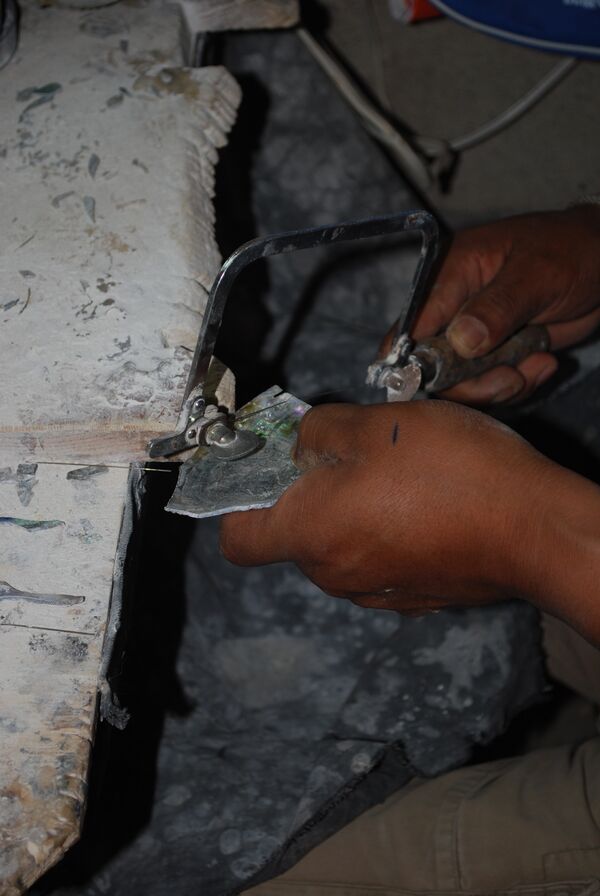 Если изготавливается небольшая мозаика, то можно слоем клея покрыть сразу все основание и тотчас же уложить на него кусочки перламутра. В том случае, если рисунок сложный, его набирают на стекле, постоянно сверяя с оригиналом, затем по стандартной схеме набор переносят на основание. Когда клей затвердеет, поверхность мозаики из перламутра шлифуют на планшайбе с применением свободного абразива и полируют.