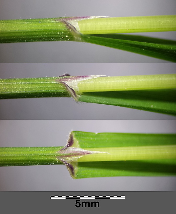 Листья линейные, тонкие, поникающие. Длина листовых пластинок 5–20 см, ширина 3–7 мм, листовые пластинки плоские.. Листья ярко-зелёные. Нижняя сторона листовой пластинки опушёна и шероховата. Листовые влагалища сросшиеся, лигулы имеют кольцевидную форму. На самом верхнем листе язычок проходит вдоль черешка на стороне, обращённой от листовой пластинки. Язычок короткий, коричневого цвета, «обтрёпанный», в направлении к пластинке имеет заострённый вырост.