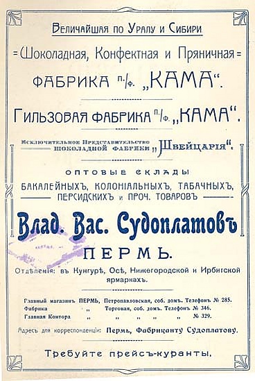 В. В. Судоплатов построил фабрику «Кама», выпускавшей пряники, баранки, карамельные конфеты, монпансье, ирис.