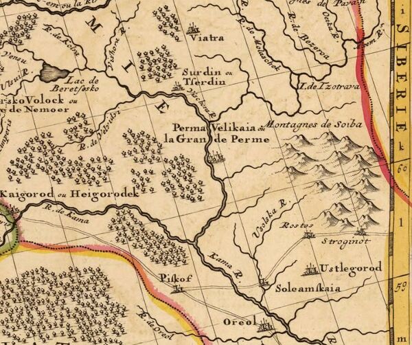 В середине XVIII на картах французского картографа Делиль Гийома (фр. Guillaume Delisle) город (Perma Velikaia) показан стоящим на берегу Вишеры между современными Соликамском (на карте Solcamskaia) и Чердынью (Surdin).