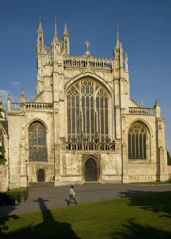 Первым крупным образцом перпендикулярного стиля стали хоры Глостерского собора (1337-50), в то время — бенедиктинского монастыря (кафедральным собором церковь стала после ликвидации монастырей при Тюдорах). Вероятно, их делал один из тех же королевских архитекторов, либо Уильям Рамси, либо Томас Кентерберийский. Стены XI века были при этой перестройке сохранены и украшены в пламенеющем стиле. Большое восточное окно в Глостере завершено тюдоровской аркой, и переплёт окна соответствует рисунку на стенах[14].