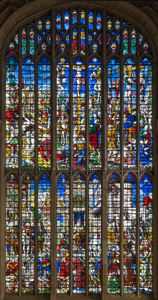 - Витражи столь велики и широки, что каменные конструкции окончательно превращаются в систему опорных столбов. Переплёты окон дополняются горизонтальными перемычками для прочности[17].