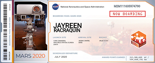 НАСА организовала кампанию «Отправь своё имя на Марс» (англ. Send Your Name to Mars), приглашая людей со всего земного шара указать свои имена для последующей их отправки на Марс со следующим марсоходом. Было отправлено 10 932 295 имён. Все имена, а также 155 эссе финалистов конкурса «Назови марсоход» (англ. Name the Rover) были нанесены электронным лучом на три кремниевые чипа размером с ноготь, после чего прикреплены к анодированной алюминиевой пластине, которая была размещена на марсоходе 26 марта 2020 года. На самой алюминиевой пластине, установленной на задней поперечной балке марсохода, методом лазерной гравировки изображены Солнце, Земля и Марс[58], а также число участников акции.