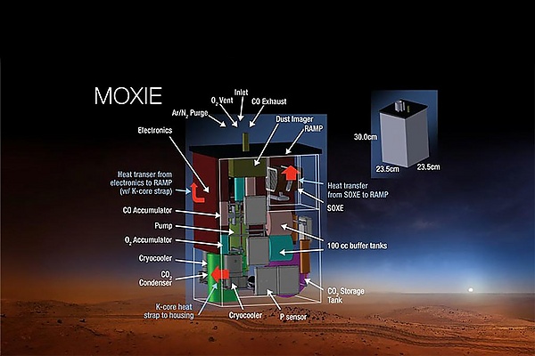 - Марсианский исследовательский эксперимент с кислородом in situ (Mars Oxygen ISRU Experiment, MOXIE), исследование технологии по производству кислорода (O2) из диоксида углерода (CO2) марсианской атмосферы[34]. Установка должна производить по 22 грамма кислорода в час на протяжении 50 солов. В случае успеха технология будет масштабирована 200:1 и использоваться для в производства кислорода в промышленных масштабах для будущих миссий на Марс, как для жизнеобеспечения людей, так и для создания ракетного топлива[34].