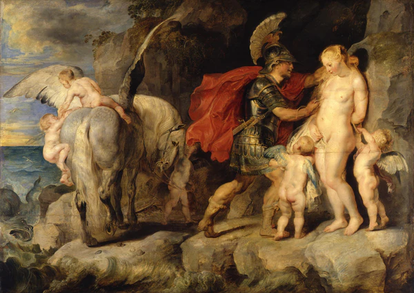 Персей (др.-греч. Περσεύς) — герой древнегреческой мифологии аргосского цикла, сын Данаи и Зевса, предок Геракла. Картина иллюстрирует античный миф об одном из подвигов героя: освобождении Андромеды, дочери царя Кефея. Мать девушки Кассиопея разгневала нереид похвалами собственной красоте, и Посейдон в наказание наслал на царство Кефея наводнение и морское чудовище. Прорицатели от имени Амона объявили, что бедствия закончатся, только когда Андромеду отдадут чудовищу на съедение; Кефею пришлось подчиниться. Персей влюбился в Андромеду с первого взгляда и пообещал Кефею убить морское чудовище при условии, что тот выдаст за него свою дочь. Когда царь принёс клятву, герой дождался выхода чудовища на берег и либо убил его в схватке, либо показал ему отрубленной им ранее волшебным мечом голову горгоны Медузы, страшный взгляд которой всех превращает в камень. Андромеда была освобождена. Жених принцессы Финей составил заговор, желая вернуть себе невесту, но Персей узнал об этом и достал из сумки голову Медузы, так что заговорщики превратились в камень[3][4][5].