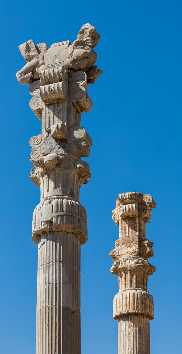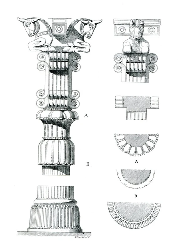 Формы колонн и капителей несколько различаются в разных зданиях. Как правило, на капителях вырезаны два сильно декорированных животных, стоящих спина к спине и выступающих из колонны. Они служат кронштейнами для поддержки архитрава или кровельных брусьев, а плоские спины животных поддерживают брусья, идущие под прямым углом (см. реконструкцию в Лувре в галерее). Поскольку фигуры выступают, животных можно назвать протомами. Наиболее распространённым животным является бык, но встречаются также львы, быки с головой человека в стиле ассирийского ламасу[8] и грифоны с головами орлов и телами львов[9].
