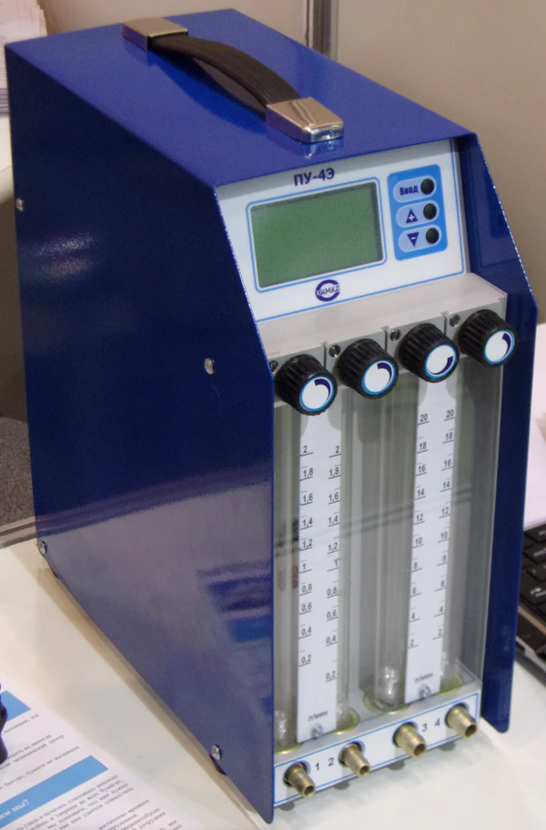 Наибольшее распространение получили пробоотборные устройства, в которых для улавливания вредных веществ используется принудительное прокачивание загрязнённого воздуха через улавливающую среду с помощью насоса. Обычно используют насосы с электроприводом от аккумулятора. У устройства может быть один, два и более каналов, расход воздуха обычно регулируется и может достигать 20 л/мин. Чтобы правильно определить концентрацию (отношение количества вредного вещества к объёму воздуха) необходимо точно знать количество воздуха, прокачанного через улавливающую среду во время замера. Расход воздуха через пробоотборник может измениться из-за, например, увеличения сопротивления аэрозольного фильтра (при его загрязнении в процессе измерений) и разрядки аккумуляторов. Поэтому во второй половине XX-го века старались провести калибровку приборов и до начала замера, и после замера, а при проведении серии последовательных замеров калибровку могли проводить в начале и в конце смены. Для измерения расходов воздуха могли использоваться, например, пузырьковые расходомеры (bubble flow meter). Позднее в насосный блок стали встраивать маленькие расходомеры — (ротаметры), что позволяло следить за сохранением постоянного расхода воздуха прямо во время работы без выключения прибора.