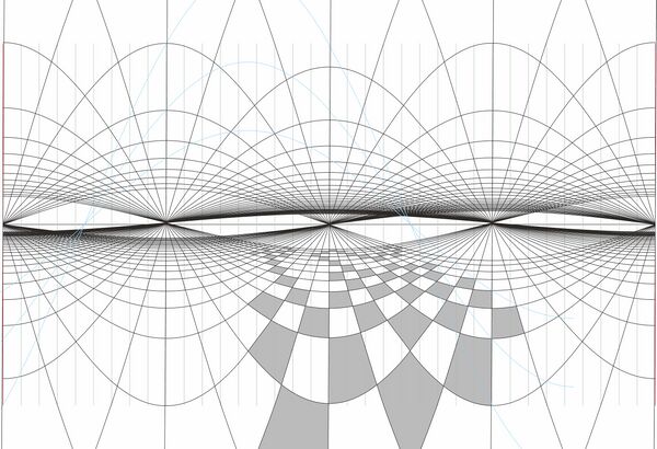 Эта плоскость перпендикулярна «главному лучу» зрения. Проекция точки зрения на картинную плоскость называется точкой схода. Она расположена на уровне глаз зрителя (уровень горизонта), который отмечается горизонтальной линией. К точке схода сводят все линии, означающие границы и членения формы, например карнизы боковых фасадов зданий. Передний план в классической итальянской перспективе изображали без сокращений горизонтальных линий (так называемая фронтальная перспектива). Альберти советует живописцам расчерчивать горизонтальную плоскость пола, земли или изображения фундамента здания, квадратами, также в системе сходящихся к горизонту линий и образующих подобие «шахматной клетки», что облегчает построение ракурсных фигур[7].