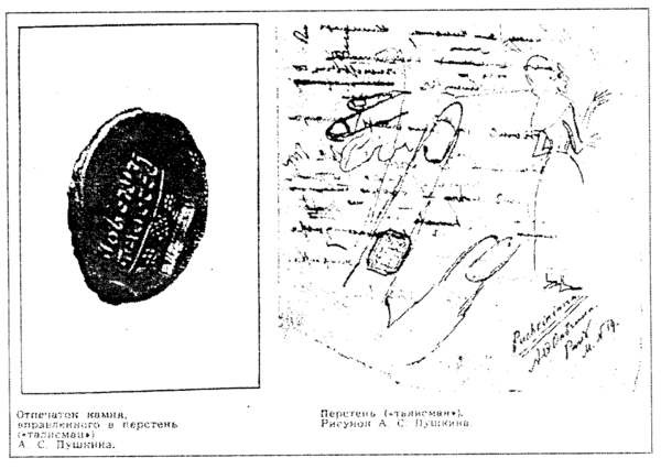 - Перстень Пушкина — кольцо-печатка с надписью на иврите, которое поэт воспел в нескольких своих стихотворениях, позже принадлежало В. А. Жуковскому, И. С. Тургеневу и Полине Виардо. Украдено в 1917 году, сохранились только отпечатки камня на воске и сургуче.