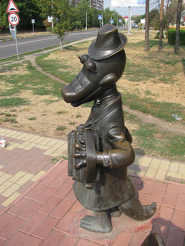 Интересно, что во многих городах России можно увидеть памятник Крокодилу Гене, который играет на гармошке и поёт «Пусть бегут неуклюже…»[4]. Такие скульптуры можно увидеть в Москве, Армавире, Кременчуге, Ростове-на-Дону, Раменском, Хабаровске.