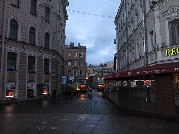 - Восточную сторону переулка формирует боковой фасад дома № 120 по Невскому проспекту. Также на восточной стороне располагаются торговые киоски (фруктово-овощные, «Роспечать»).