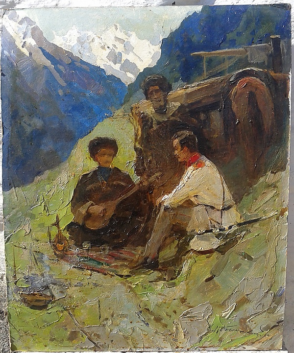 На переднем плане композиции в горном ущелье изображены три мужские фигуры. Справа находится М. Ю. Лермонтов, сидящий на уступе с руками на коленях, в белом мундире с красным воротником, золотыми эполетами и шашкой на тёмной портупее. Слева от него — молодой горец в тёмно-коричневой черкеске с газырями и в папахе, сидящий по-турецки и играющий на струнном инструменте с длинным грифом. Между ними расстелен полосатый коврик с кувшином и бокалами, а слева от коврика расположен дымящийся очаг с котелком. За фигурами Лермонтова и горца стоит ещё один горец с бородой в папахе, за его спиной видна часть низкого строения с окном и плоской кровлей. Между этим горцем и Лермонтовым находится конь под седлом. На заднем плане открывается вид на горы.