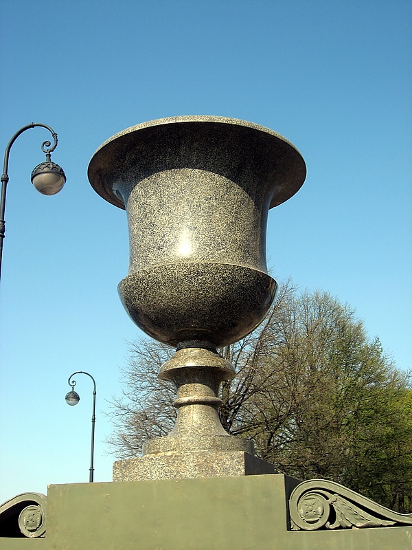 На спуске установлены большие порфировые вазы. они были установлены на чугунные постаменты с волютами, отлитыми по проекту архитектора Л. И. Шарлеманя. Эти пьедесталы были сделаны вместе с пьедесталами львов Дворцовой пристани.[3]