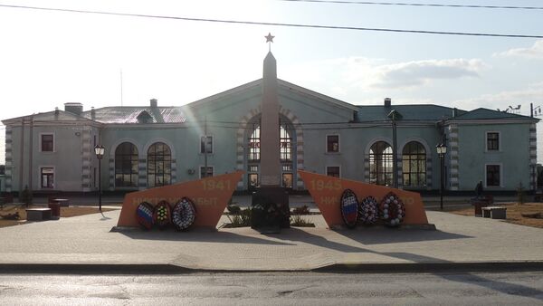 - Около вокзала стоит паровоз времён Великой Отечественной войны. Справа от паровоза стоит памятник Волжской рокаде.