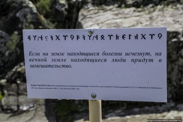 Рунические надписи представляют собой особую гордость Алтая. В этом месте на скалах выбиты 30 строк, что является самым большим скоплением рунических надписей в России. Переводил руны И. Л. Кызласов[6] – российский историк и археолог.