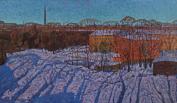 Картина представляет собой зимний городской пейзаж, в котором на переднем плане выделяются синие тени от деревьев, падающие на снег. На втором плане изображены многоэтажные дома, выполненные в красно-оранжевых и жёлтых тонах, а также редкие фигурки людей. Справа находится небольшое коричневое строение, слева — парк. Дальний план образует ровная линия городских построек, а линия горизонта расположена высоко. На фоне голубого неба чётко выделяется силуэт телевышки. Точка зрения выбрана сверху, что придаёт композиции ощущение панорамности.