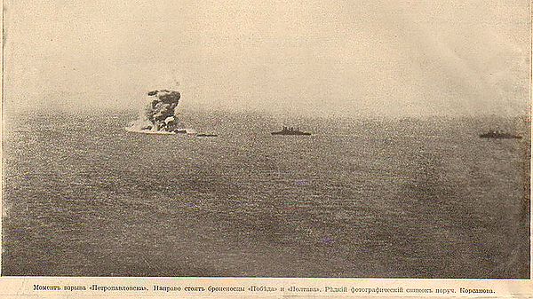 На мачте «Петропавловска» взвился сигнал: «миноносцам войти в гавань», и он на малом ходу начал поворот вправо. В 9.43 в носовой части корабля с правого борта раздался взрыв, пришедшийся на район носовой башни главного калибра. Боезапас сдетонировал. Силой взрыва были сброшены за борт носовая 305-мм орудийная башня, дымовые трубы и кожухи. Обрушившаяся фок-мачта разворотила командирский и ходовой мостики. Через минуту броненосец погрузился в воду носовой частью[19]. Затем последовал взрыв котлов, после которого «Петропавловск», разломившись на две части, ушёл под воду[20]. Вот как описывает один очевидец эту страшную катастрофу: «Я стоял на перепелочной горе, где собралась масса публики с биноклями и подзорными трубами. Все напряженно следили за движением эскадр, ожидая боя. Дул холодный ветер. Тем не менее, морской горизонт застилался синеватой дымкой — туманом. Сперва нам было не понятно, почему наши суда возвращаются на рейд, но вскоре мы заметили на восточной стороне появление неясных силуэтов — один, другой, третий, еще и еще… Вдруг около „Петропавловска“ показался столб дыма, один, другой с огромным пламенем. Раздались крики и вопли: „Петропавловск погибает!“ Не хочется верить, но его уже нет над водой…»[21]