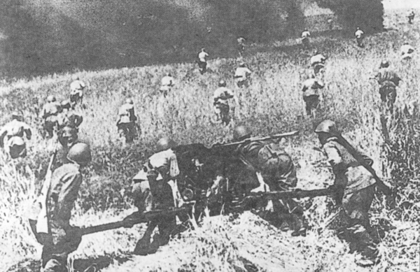 В начале Великой Отечественной войны стрелковые войска РККА применяла тактику массированной атаки всеми силами и средствами. Атаку предварял артиллерийский обстрел позиций противника. Стрелковые войска атаковали с окончанием артподготовки и одновременно с переносом огня артиллерии вглубь обороны противника. Пехотинцы, ведя огонь изо всех видов личного оружия, броском всех сил сближались с противником на минимальное расстояние, забрасывали окопы противника гранатами и переходили в рукопашную схватку. Совместное действие стрелковых и бронетанковых войск повышало эффективность и быстроту атаки. Переход от массированных пехотных атак к комбинированному использованию тяжёлой техники и подразделений пехоты, к концу войны, ознаменовал собой начало развития советской доктрины общевойскового боя[10]. Ключевым в этой тактике наступления была быстрота и натиск. В ряде случаев обороняющиеся, чтобы не быть уничтоженными в тесном пространстве окопов, контратаковали. Сходную тактику применяли войска вермахта.