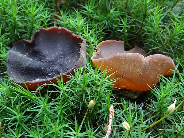 Средних размеров чашевидный дискомицет. Плодовое тело 2—10 см в диаметре, сначала чашевидное, затем раскрывающееся до почти блюдцевидного, с волнистым, редко разрывающимся краем. Внутренняя спороносная поверхность (гименофор) различной интенсивности (от тёмно- до светло-) оливково-коричневого цвета, гладкая. Внешняя стерильная поверхность красно-коричневая, мелкочешуйчатая. Ложная ножка не выражена.
